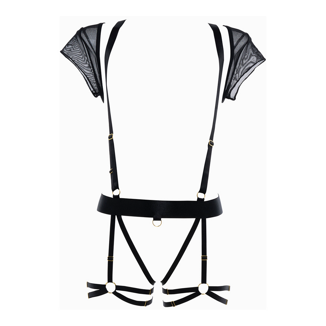 Voor de fashionista die de verleidster ontmoet. Zeker niet voor Zoom, deze is alleen in persoon. Aangehechte mesh bolero-top met verstelbare voor- en achterbanden smelt samen in een volledig open panty met verstelbare banden. Om de look nog zoeter te maken, accentueren jarretelbanden de heupen met aangehechte verstelbare beenbanden.