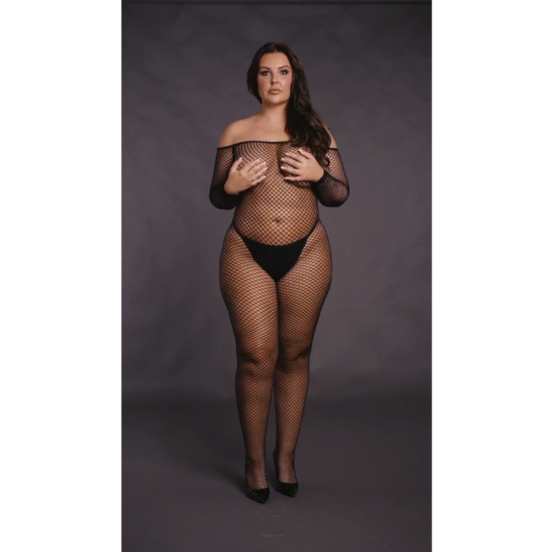 Bodystocking met lange mouwen, flatterende off-shoulder halslijn en open kruis. Het visnetdessin definieert de rondingen van het lichaam. De zachte super stretchy stof past in de maten XL tot 4XL.